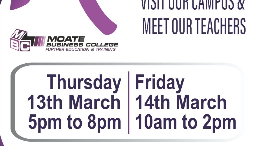 Moate Business College are holding two Open Days this coming March. Our Open Days will take place on Thursday 13th March from 5pm to 8pm, and Friday 14th March from 10am to 2pm.